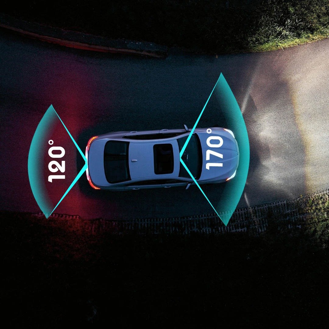 عدسات الكاميرا الخلفية الواسعة بزاوية 120 درجة والكاميرا الأمامية القابلة للتعديل بزاوية 170 تقضي تقريباً على النقاط العمياء، وتلتقط رؤية شاملة للطريق.